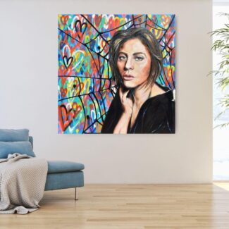 In this vibrant canvas, I’ve infused my passion for emotion and color, blending acrylics, oils, ink, and spray into an energetic symphony. My figurative expression, bridging fine art with the dynamism of pop and semi-abstract, seeks to capture the complexity of human depth amid the chaos of feelings, symbolized by the vivid hearts. This painting, pulsating with life, promises to charge any space with creativity and inspiration.