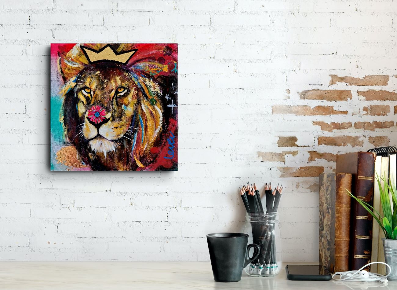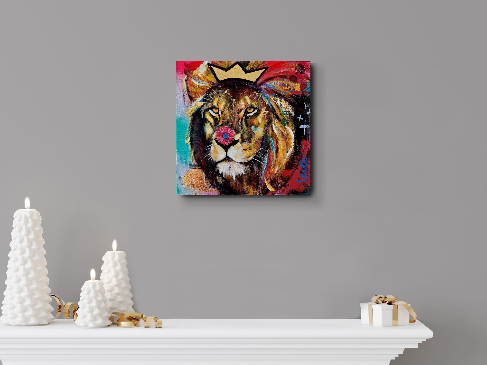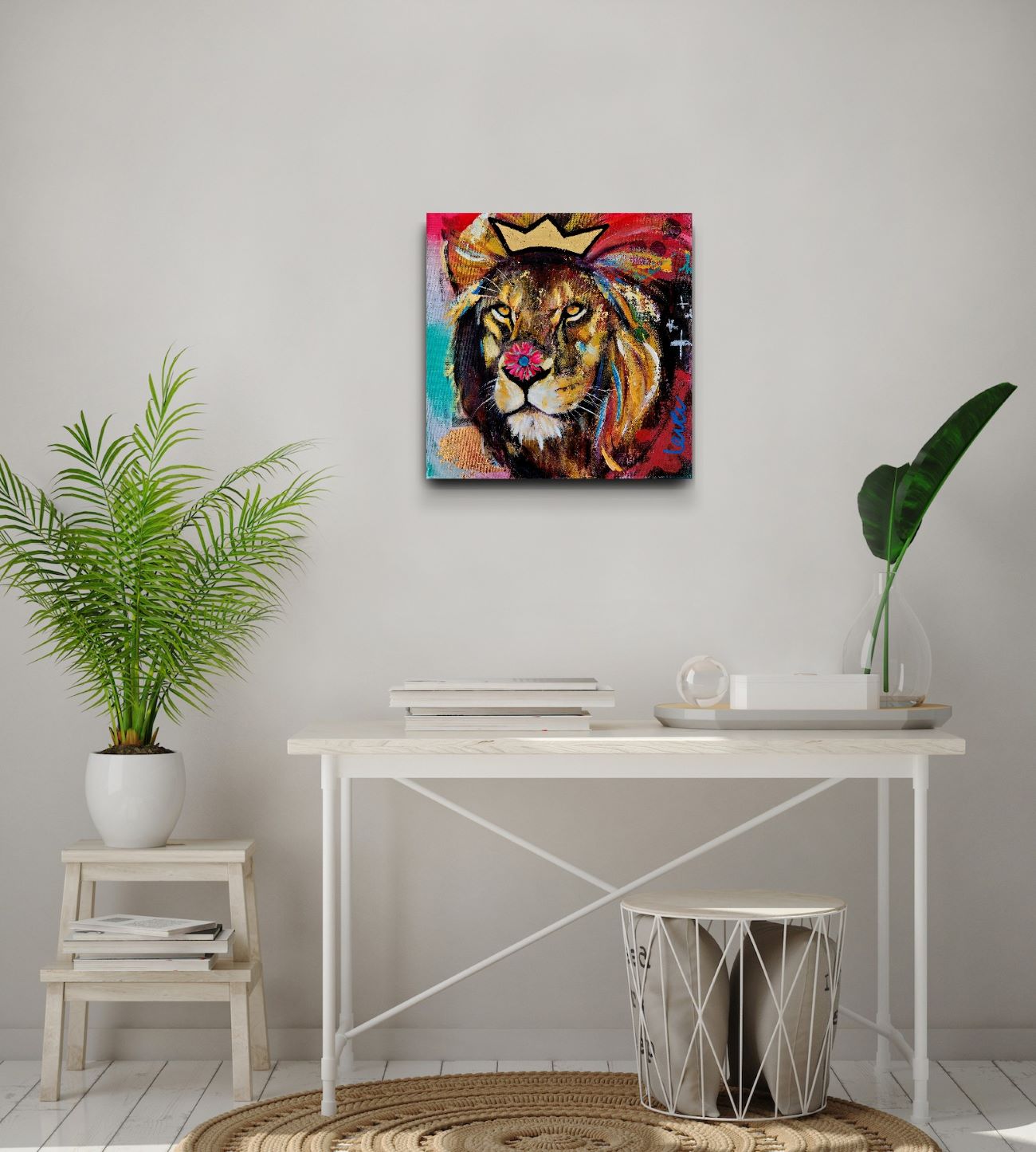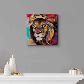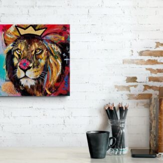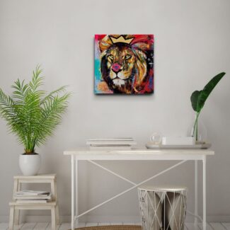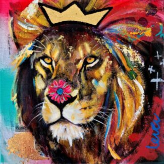 A small scale painting of a lion with a crown on his manes and a flower on top of his nose in my series ‘Stay Wild’. The neon colours and the graphic lines give this painting a playful pop-art feel!