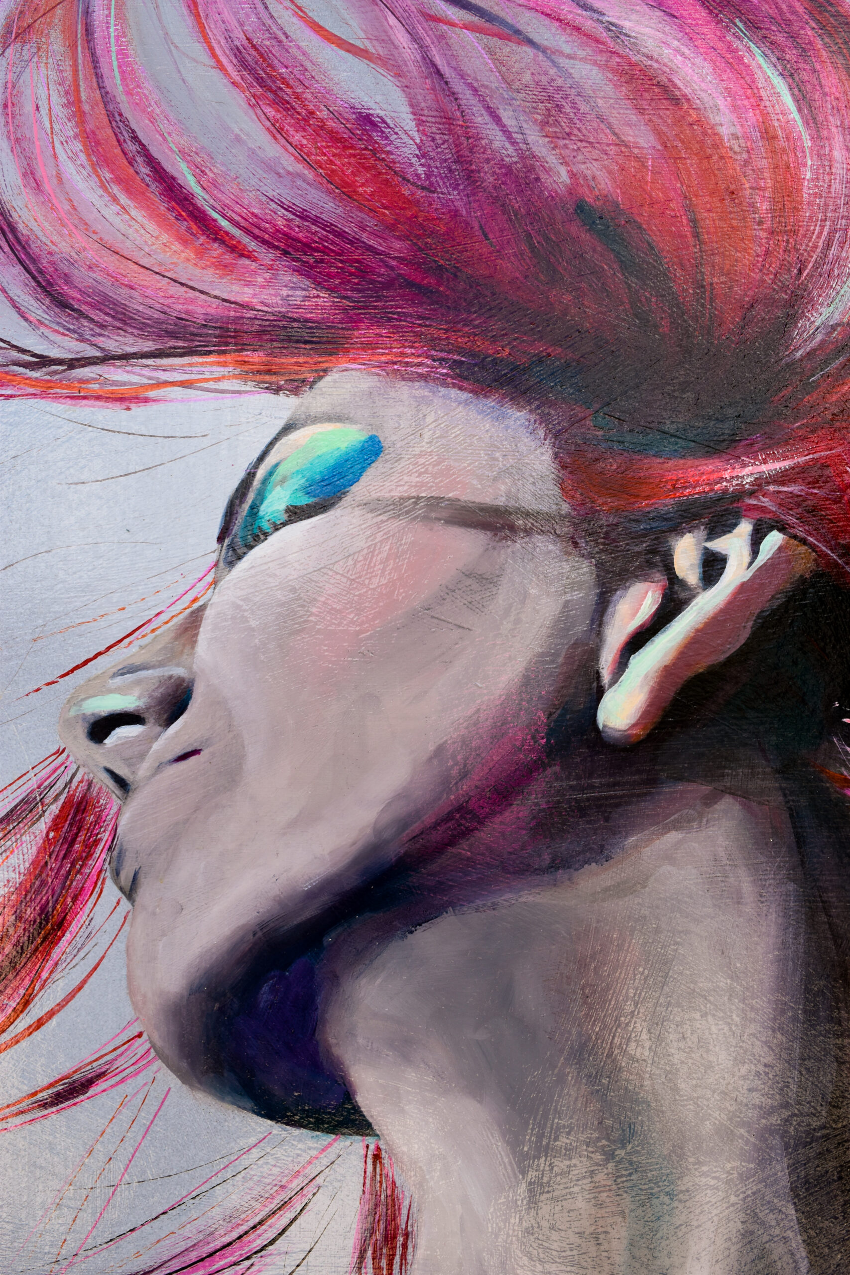 With her head thrown back and hair ignited in a blaze of fuchsia and crimson, Ecstasy captures a fleeting, euphoric moment of absolute surrender. There is no filter here—only sensation, color, and freedom. Her eyes are closed, yet her entire being radiates presence. That electric flash of blue on her eyelids hints at fearless self-expression, while the silvery background lets her pulse through the artwork like music turned all the way up.