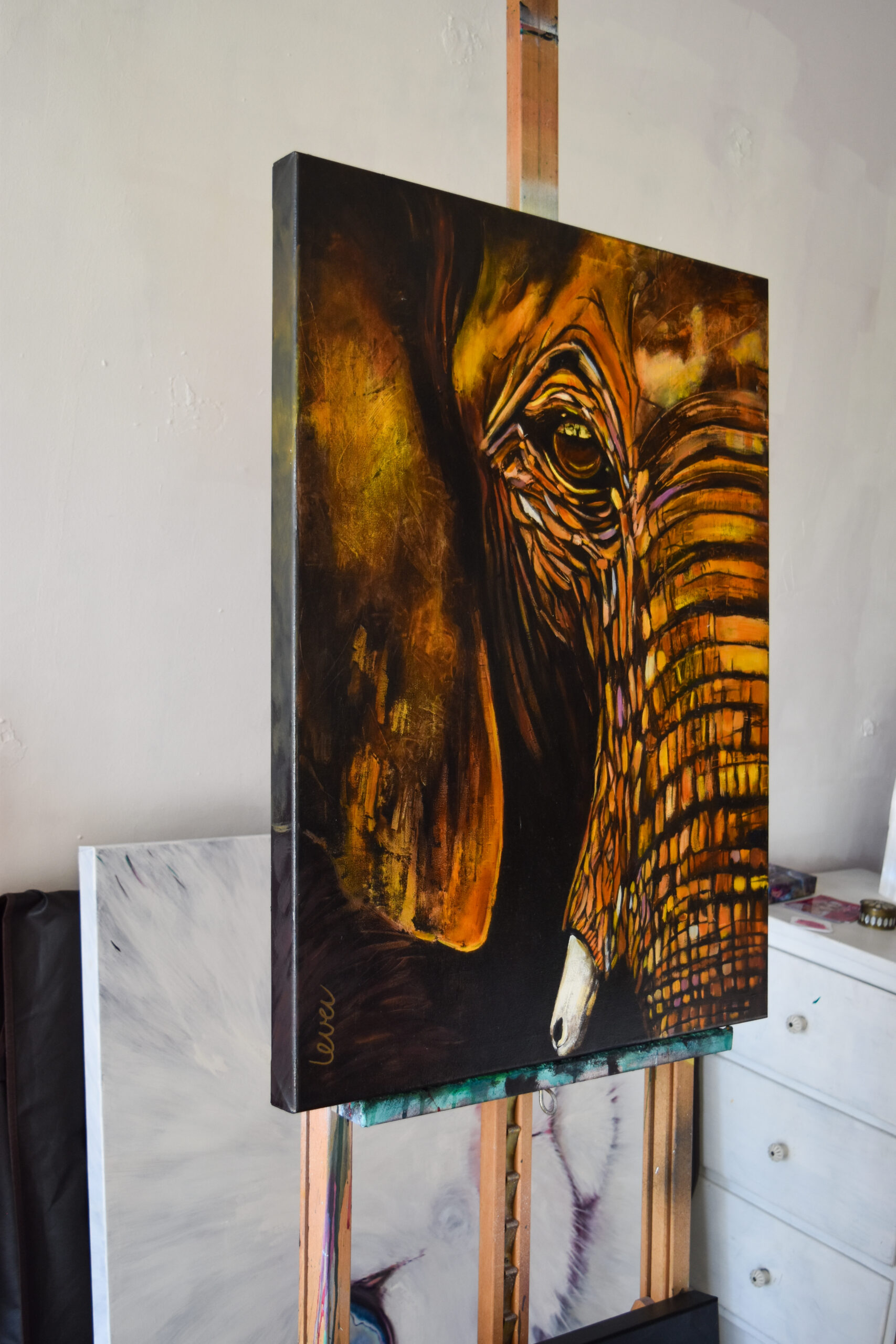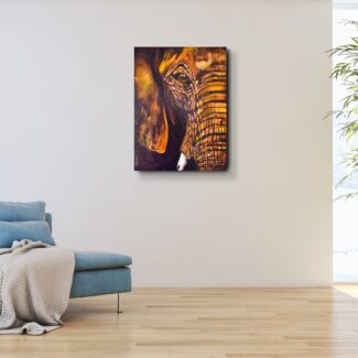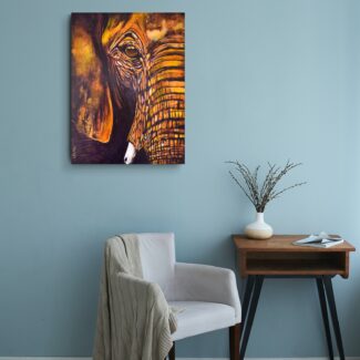 Gentle is a quiet, grounded presence — the cropped face of an elephant emerging from deep, warm tones, meeting your gaze with unwavering calm. With just one eye, part of an ear, and a soft curve of trunk visible, this piece radiates a sense of intimacy and strength.