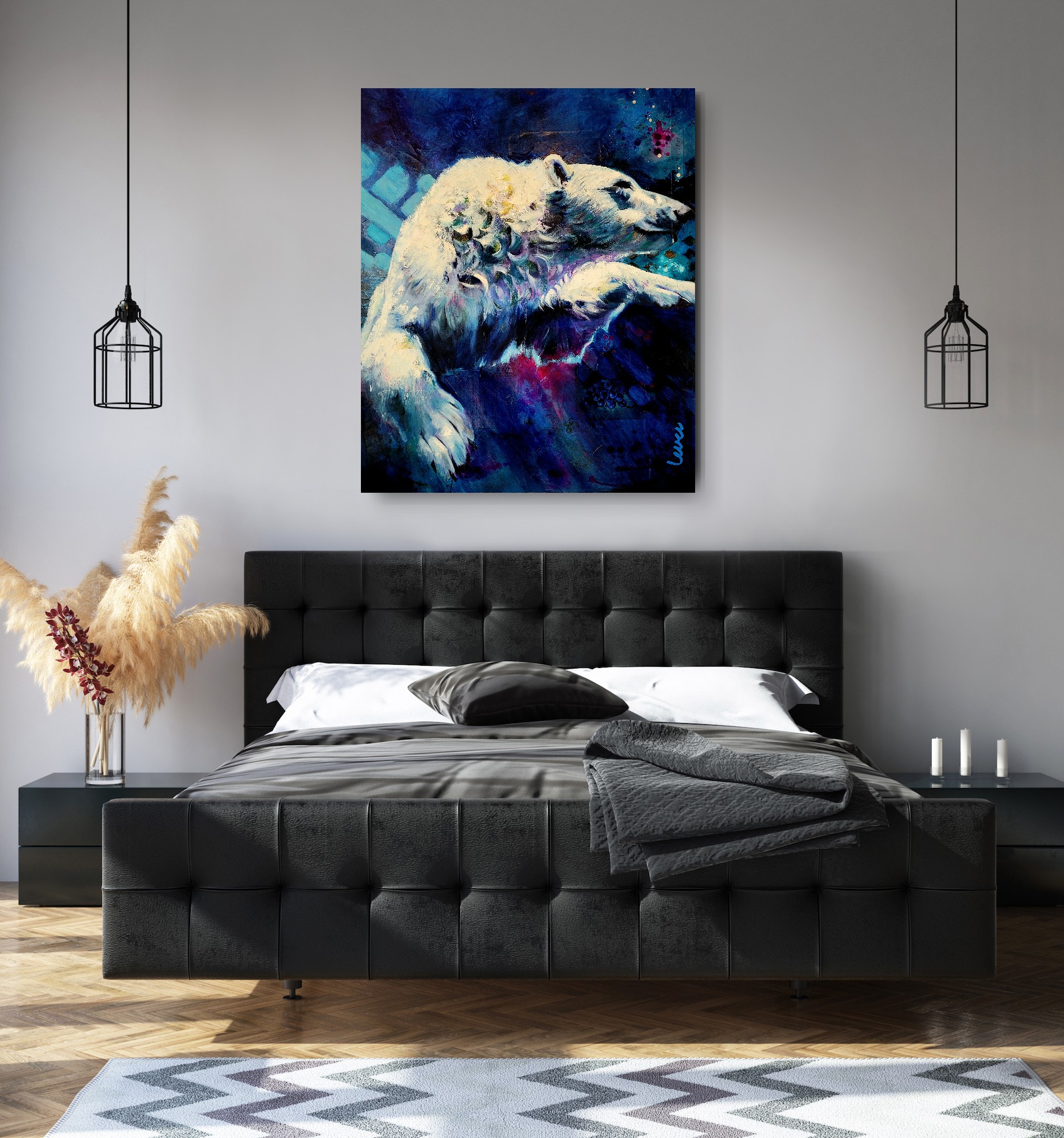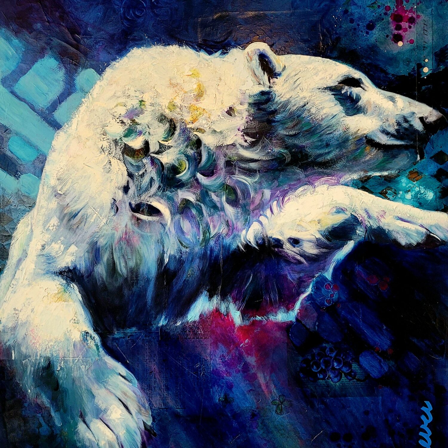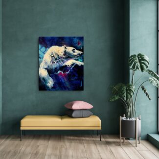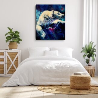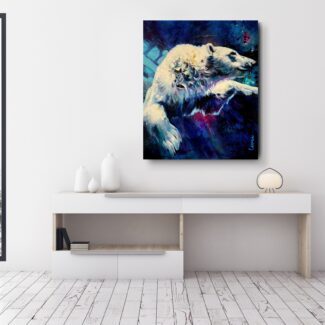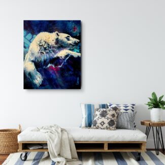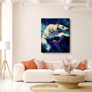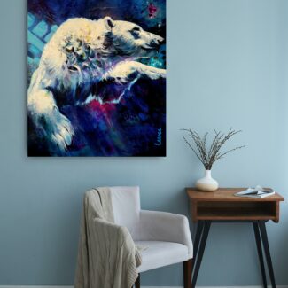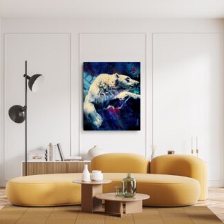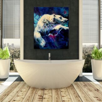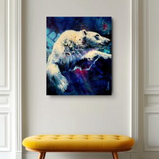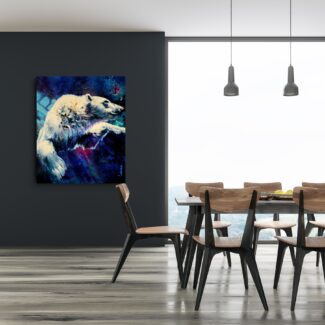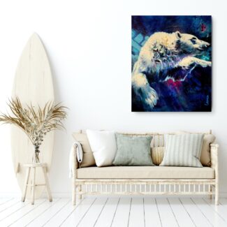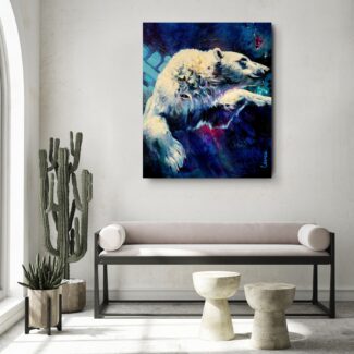 The polar bear moves powerfully through deep water, suspended between strength and surrender. Eyes half closed, it trusts instinct and momentum, navigating unseen depths with quiet determination.