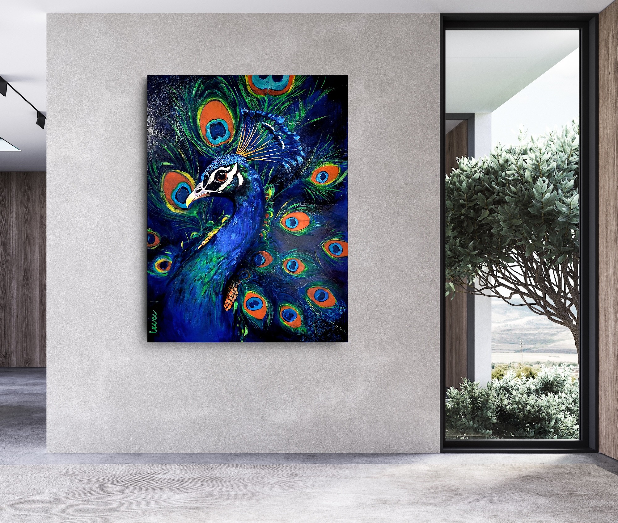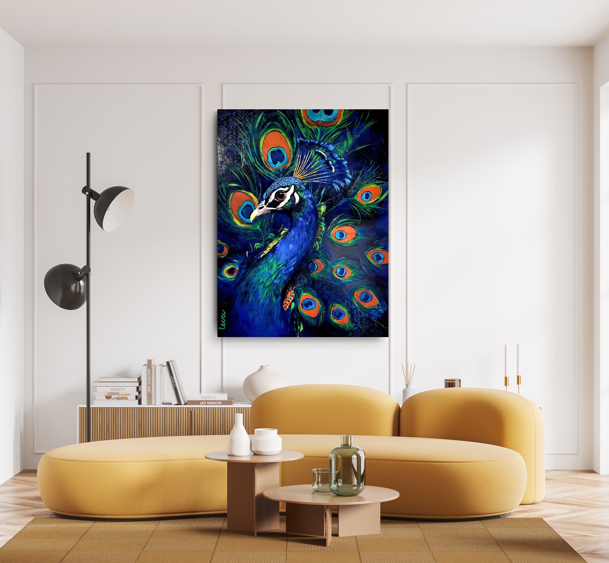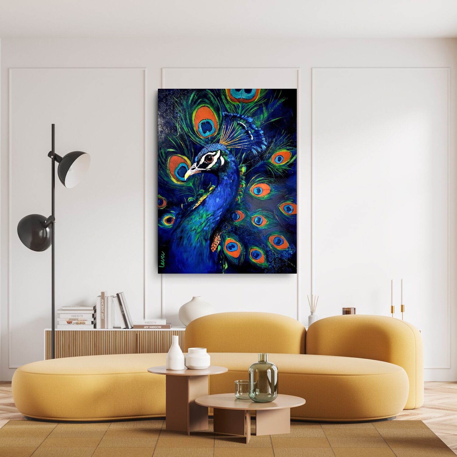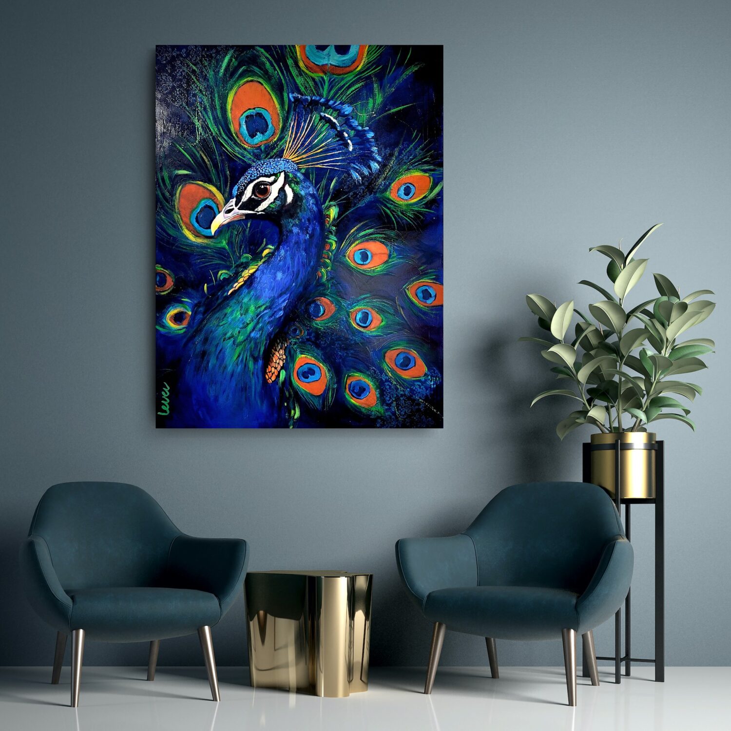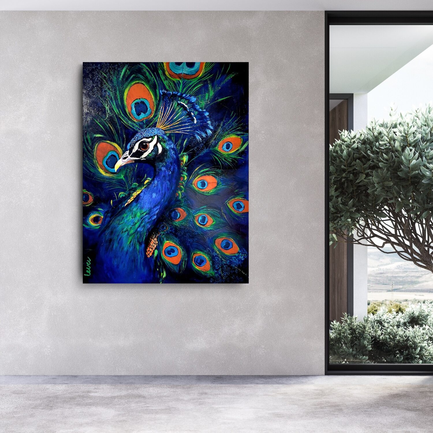 The peacock, feathers fully extended, stands as a symbol of visibility and earned confidence. Not the kind rooted in perfection, but the kind that emerges after doubt, effort, and perseverance. Each layer in this painting mirrors the process of growth itself — messy at times, demanding patience, yet ultimately revealing strength.