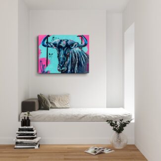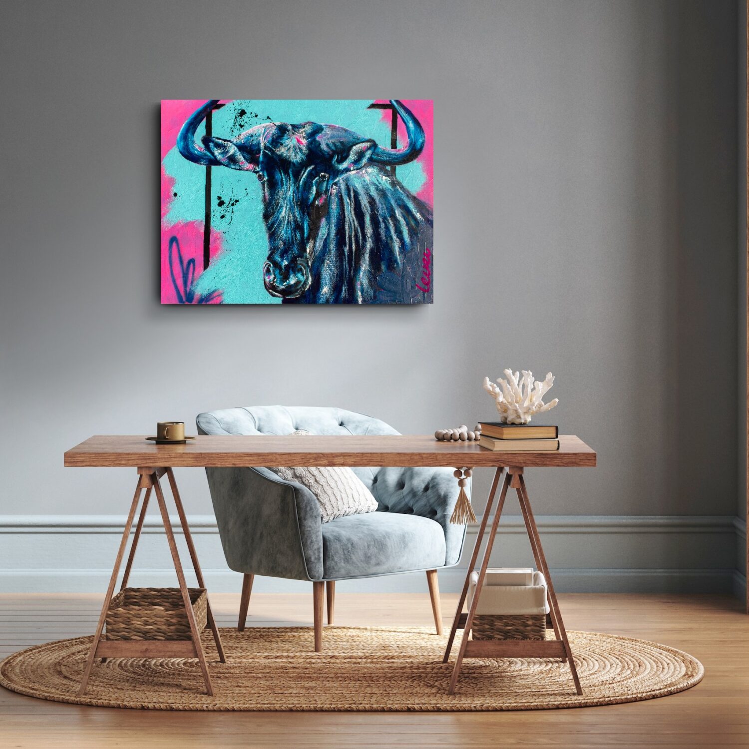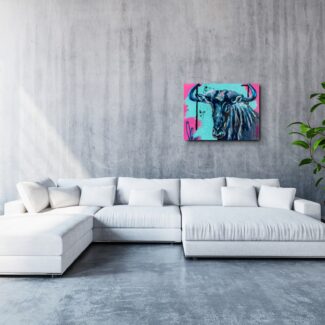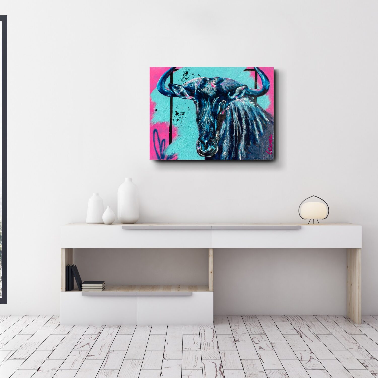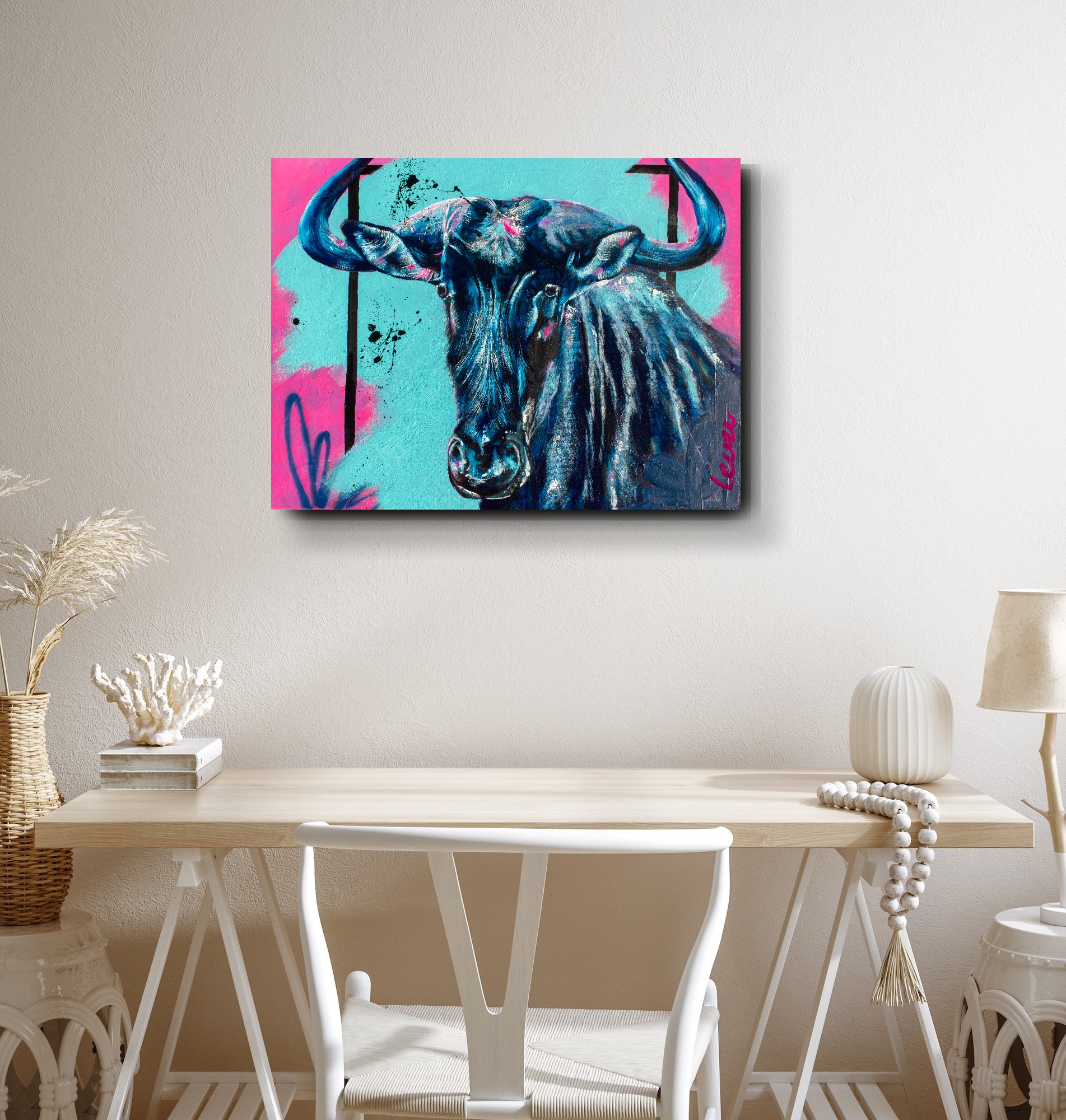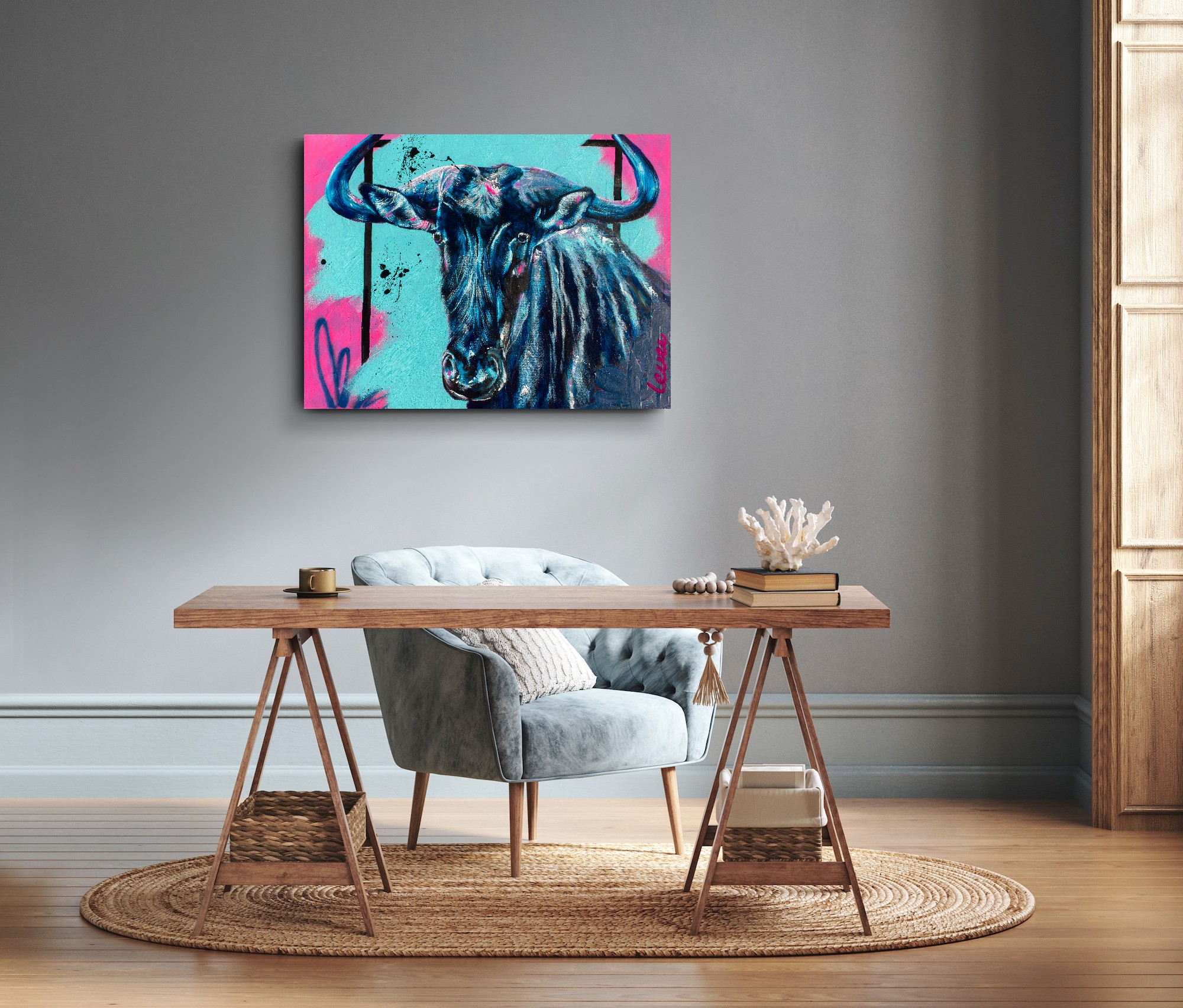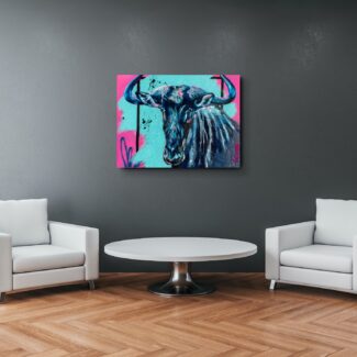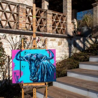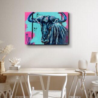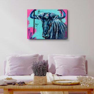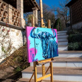 In “Wildebeest Wonder,” vibrant layers of pink serve as a backdrop to a majestic wildebeest, its gaze locking onto the viewer with curiosity. Bold strokes of vibrant blue, framed by precise black lines, accentuate its presence against the vivid background. This mixed-media painting invites viewers on a visual journey into the heart of nature’s beauty and wonder.