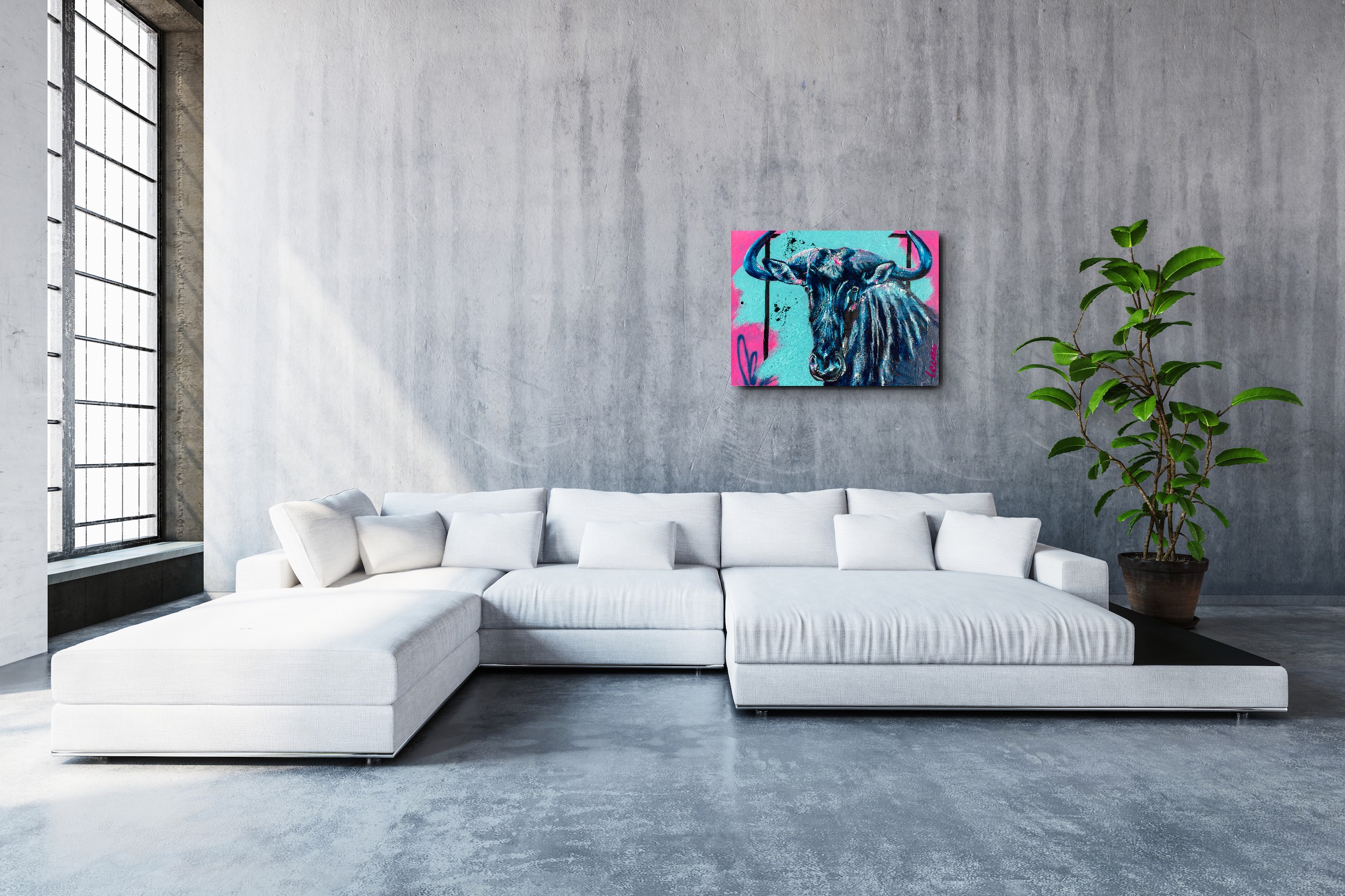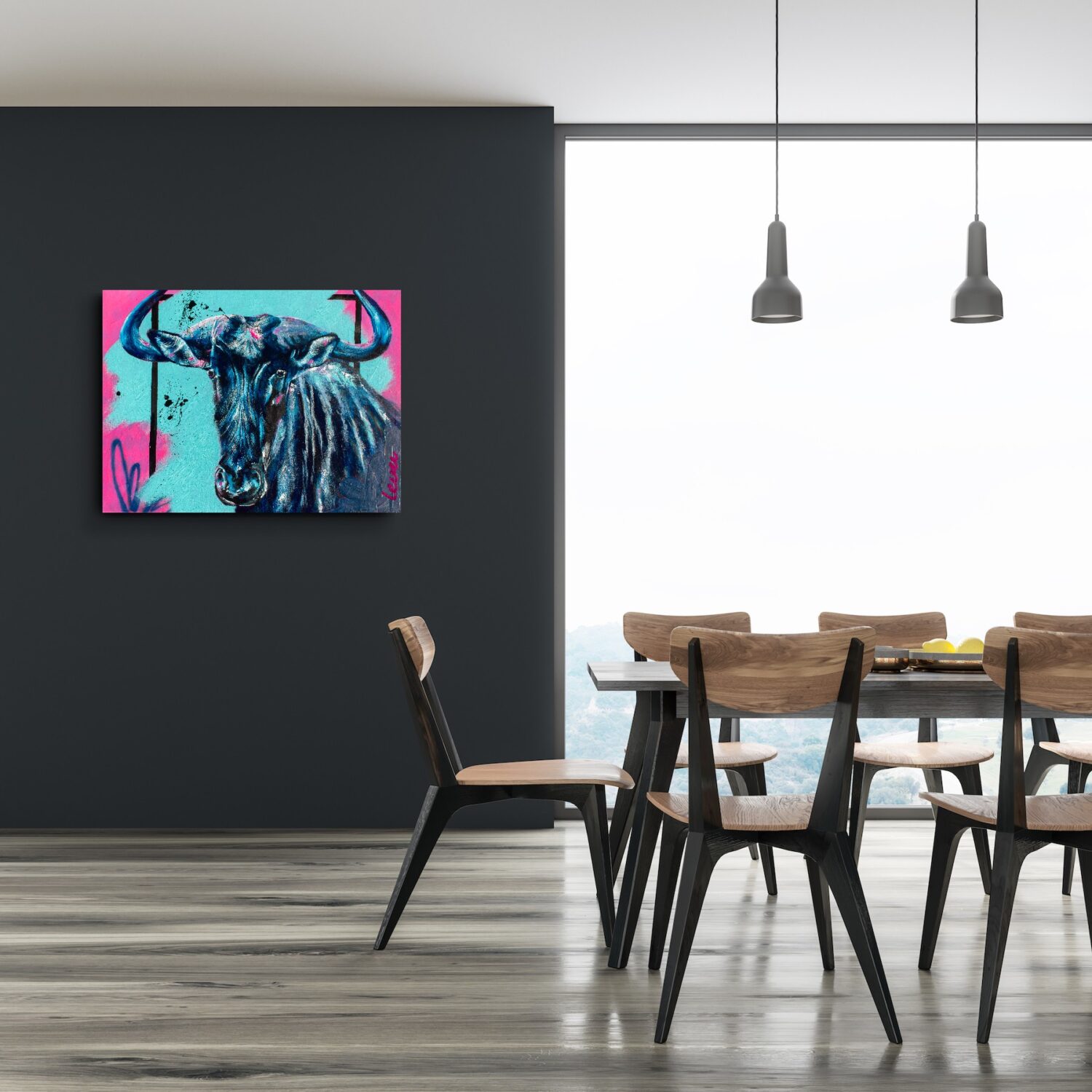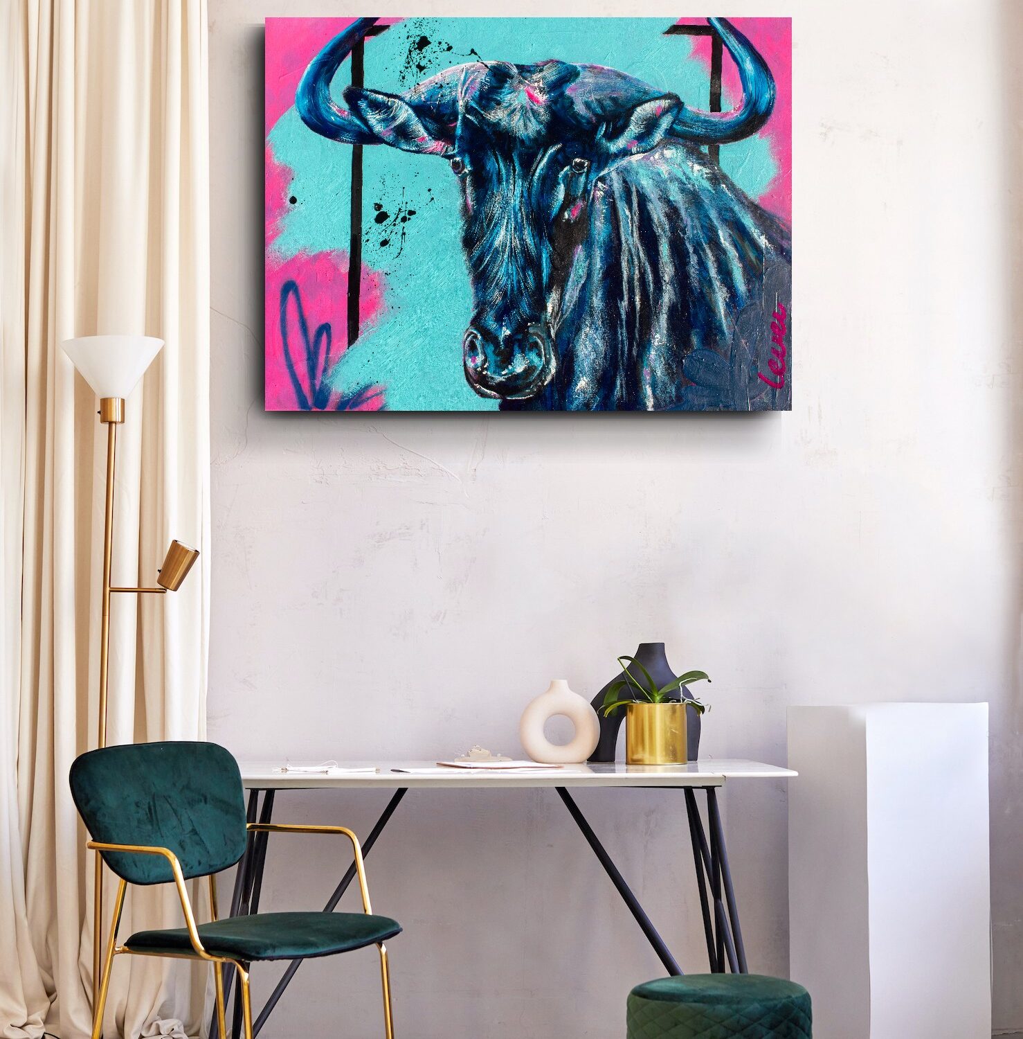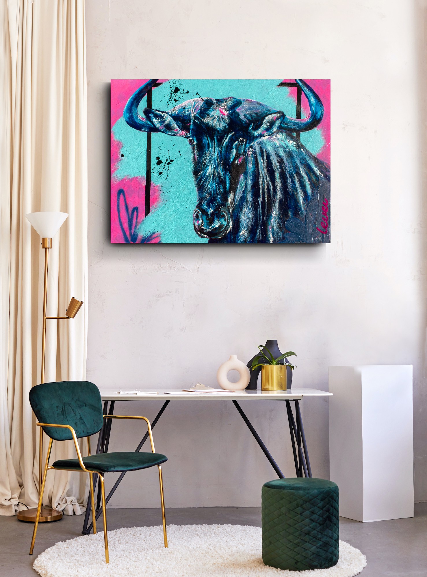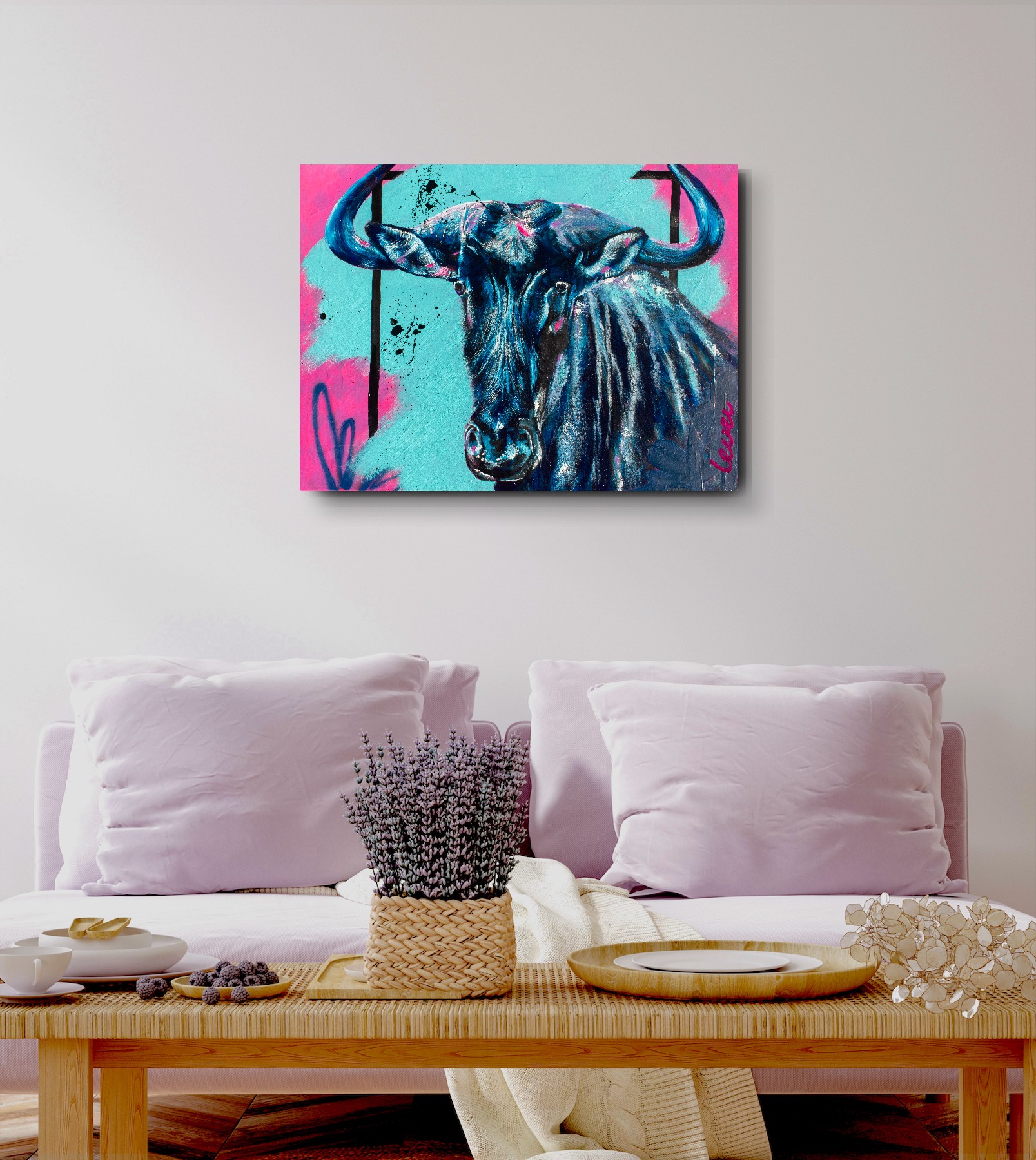 In “Wildebeest Wonder,” vibrant layers of pink serve as a backdrop to a majestic wildebeest, its gaze locking onto the viewer with curiosity. Bold strokes of vibrant blue, framed by precise black lines, accentuate its presence against the vivid background. This mixed-media painting invites viewers on a visual journey into the heart of nature’s beauty and wonder.