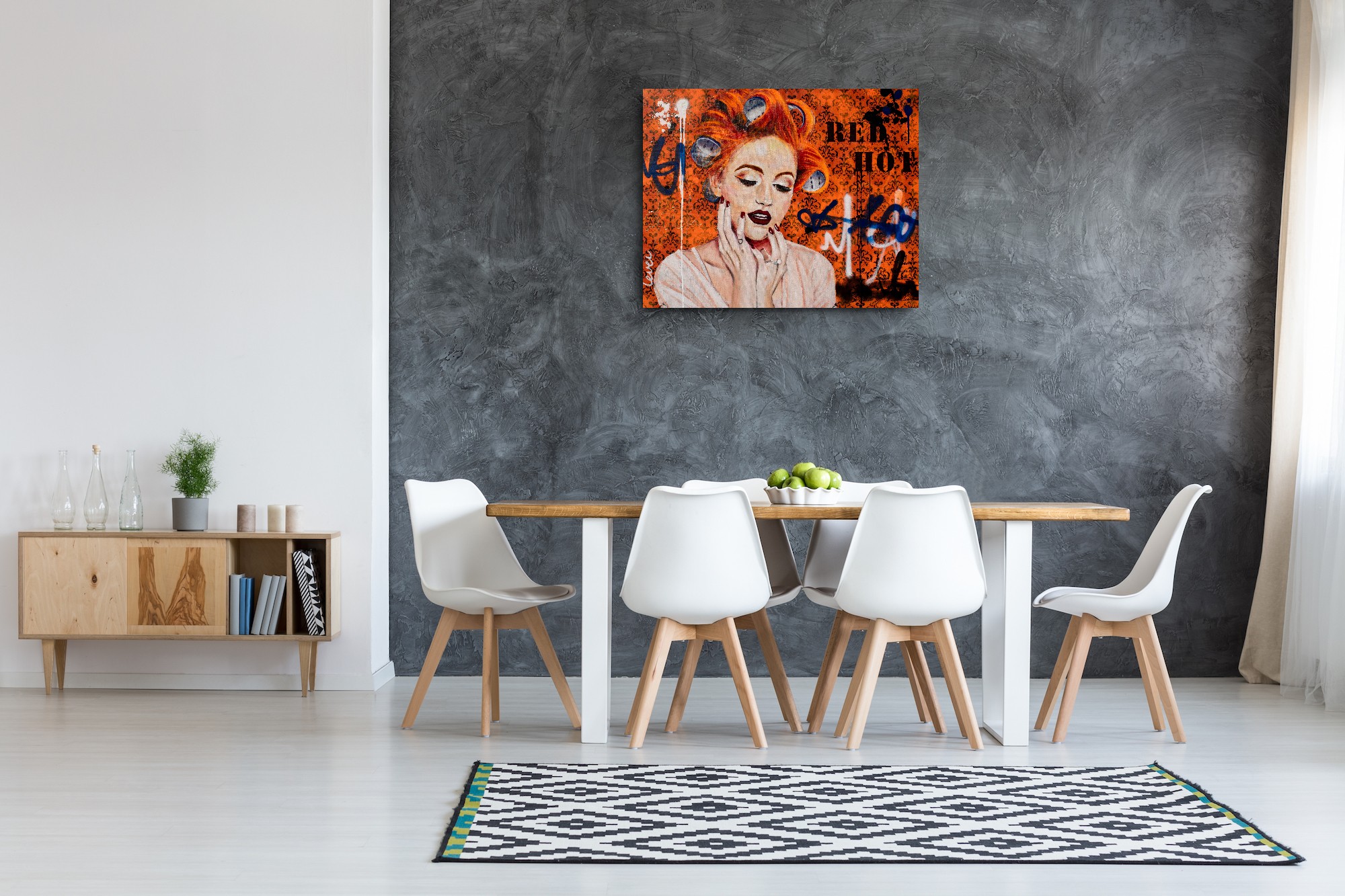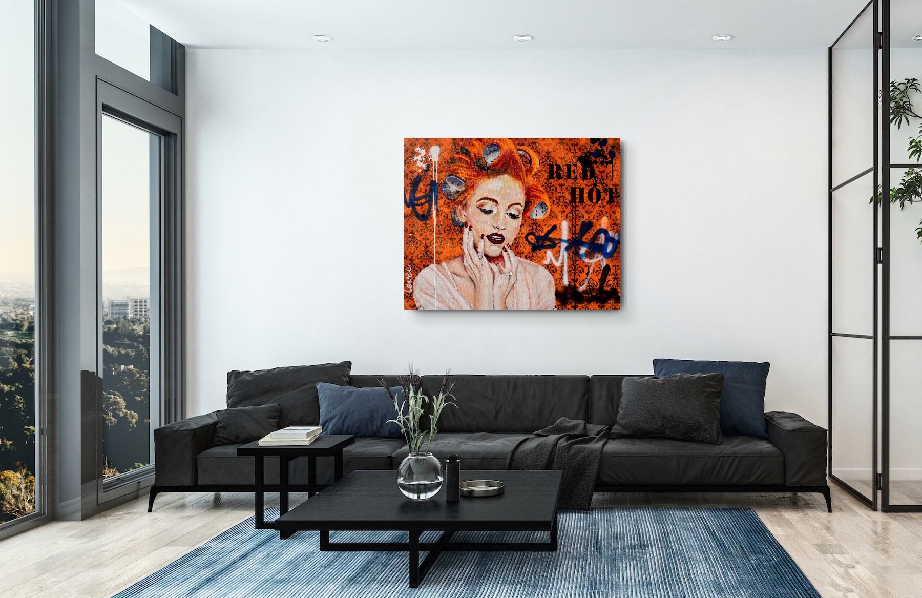In this joyful series, Bianca combines street art, pop art, and fine art into a contemporary fun mix. The background of this painting consists of different layers of spray paint, acrylics, markers, and ink. The figure is created using charcoal, acrylics, markers, and oils.