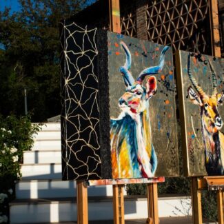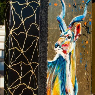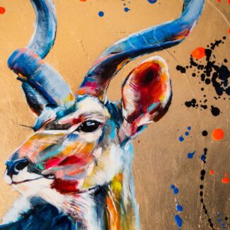 In this painting, the Kudu emerges not just as a subject but as a guardian of its natural realm, a symbol of the strength and fragility of our planet’s wildlife. The composition harmonizes the bold with the delicate, the wild with the refined, and the opulent with the natural, inviting viewers to contemplate the intrinsic beauty of nature and the urgent need for its preservation.”
