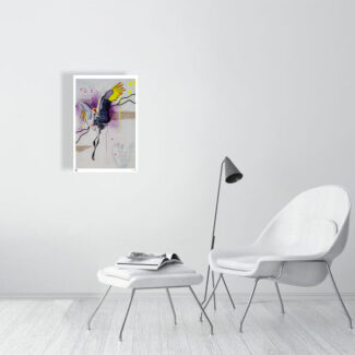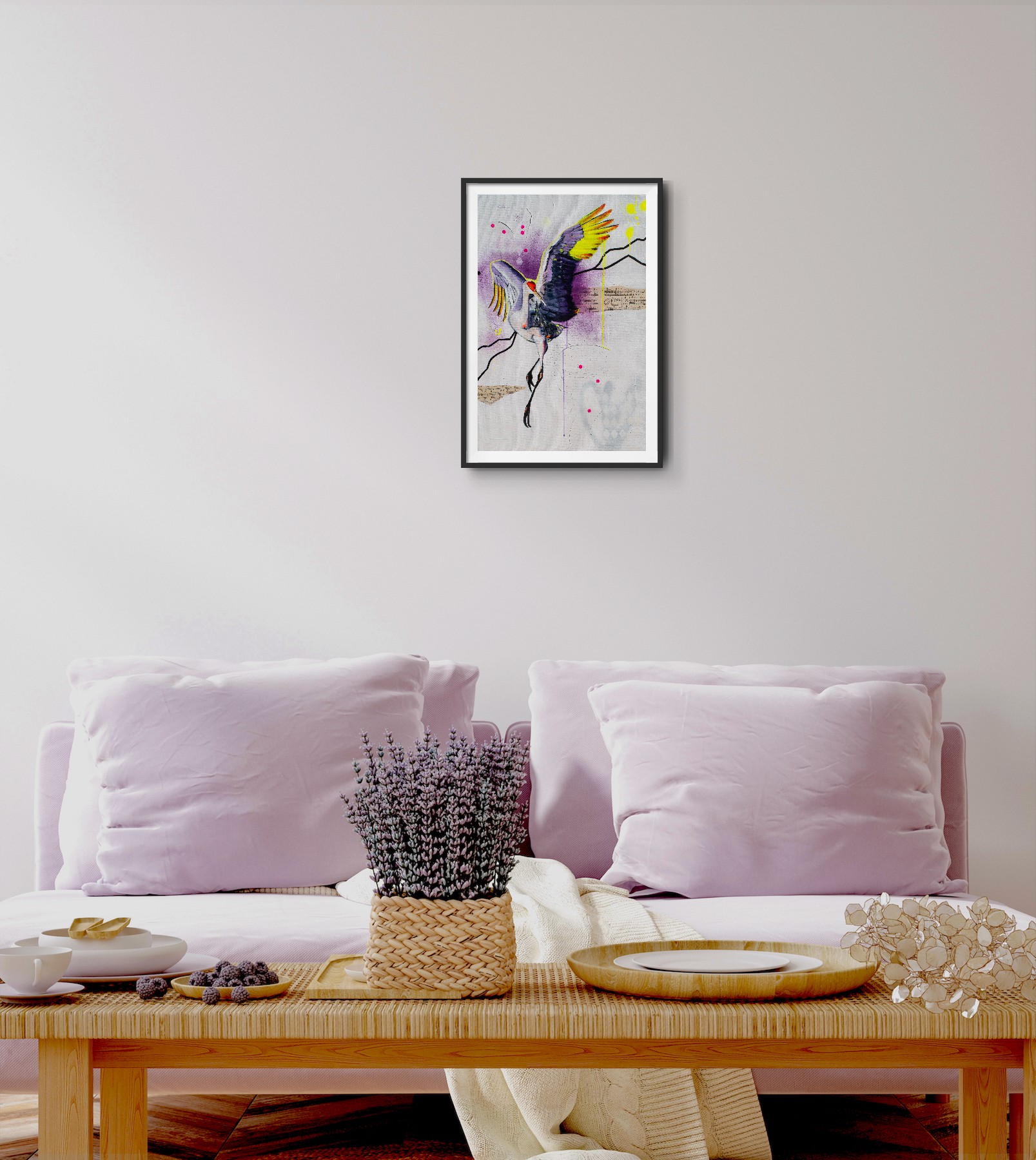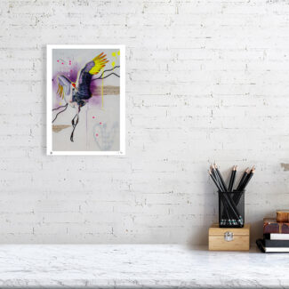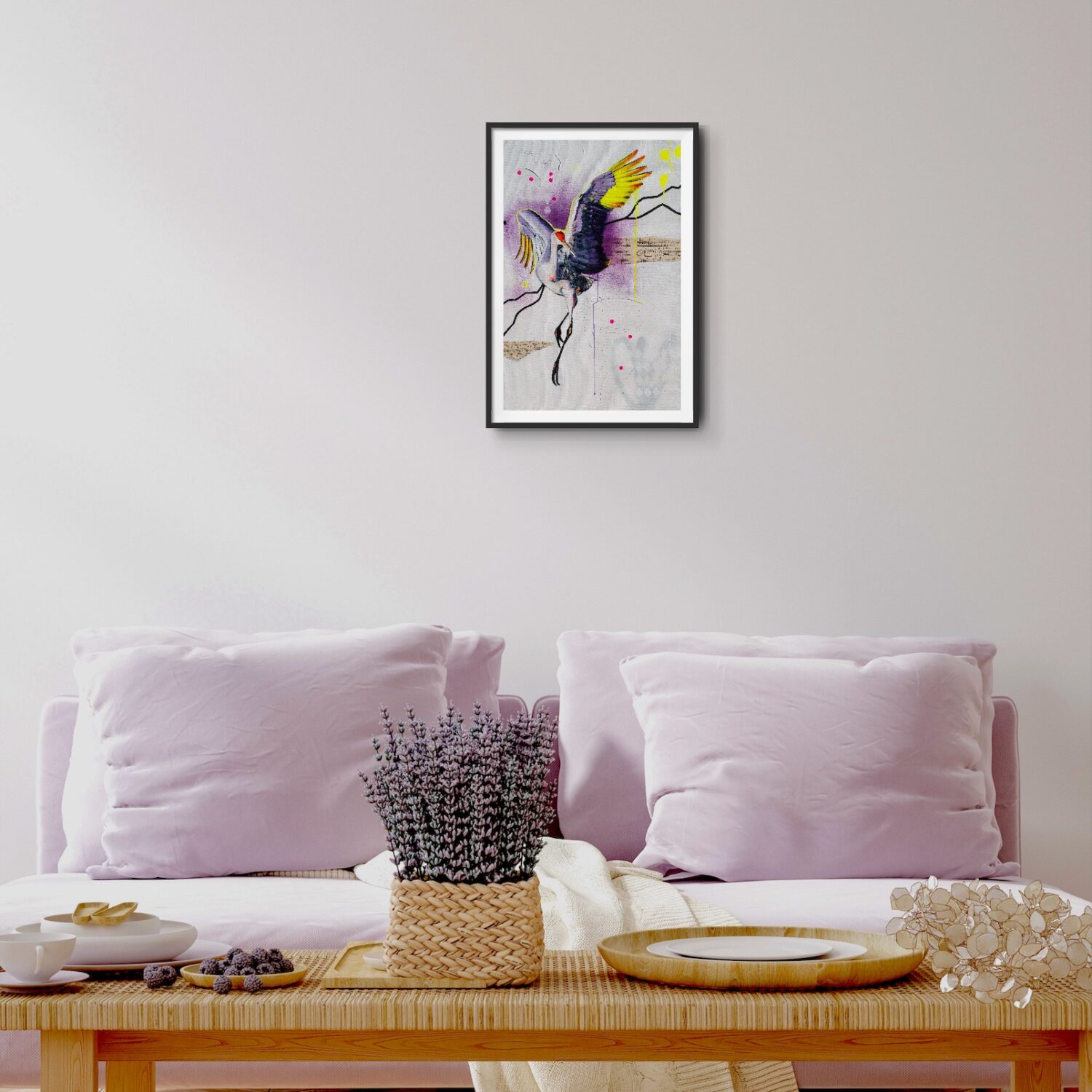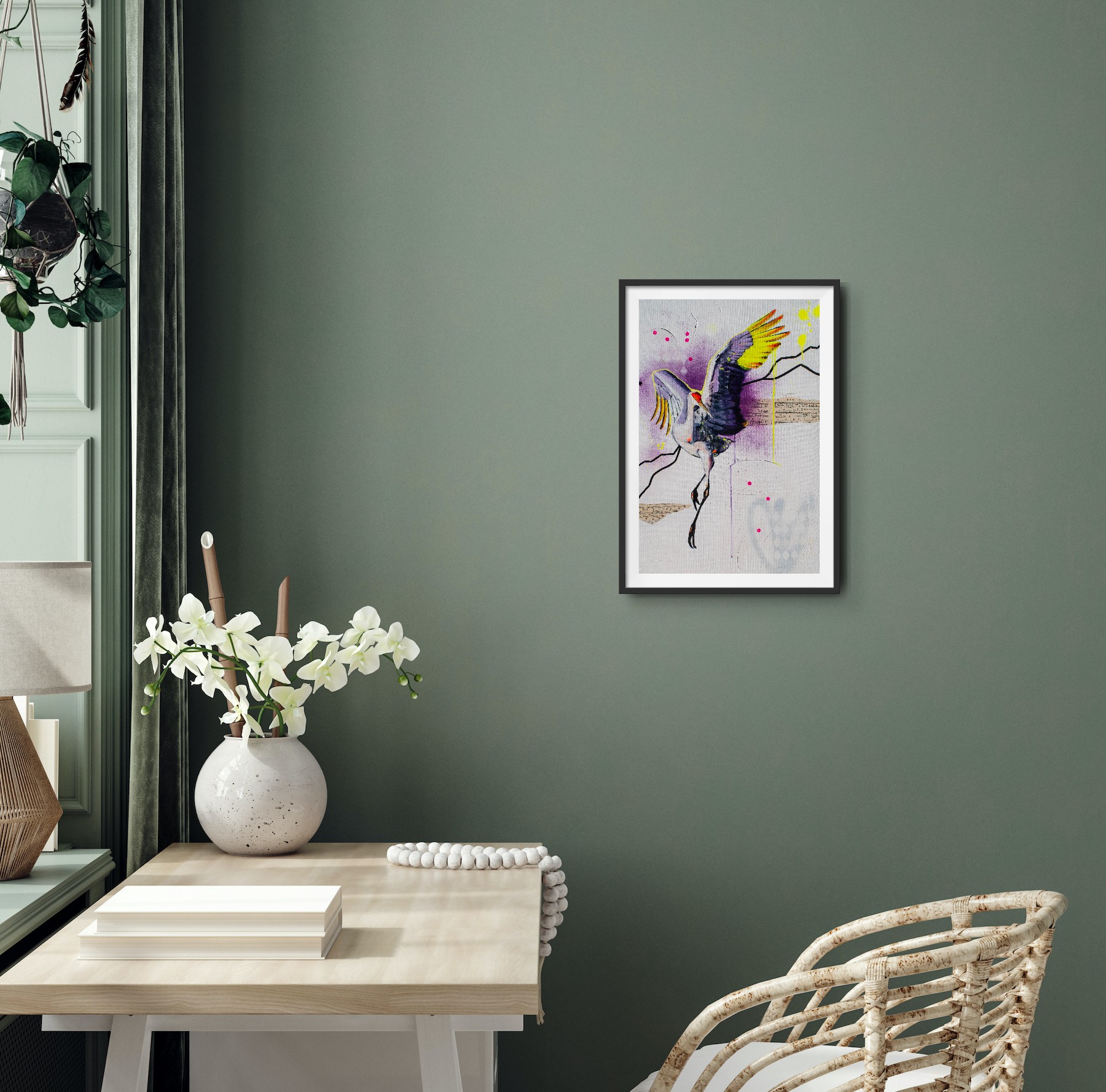 Imagine this mesmerizing crane art print on your wall, bringing a sense of movement and joy to your surroundings. Let the vibrant energy and elegance of this artwork inspire you to celebrate life and uplift your space.